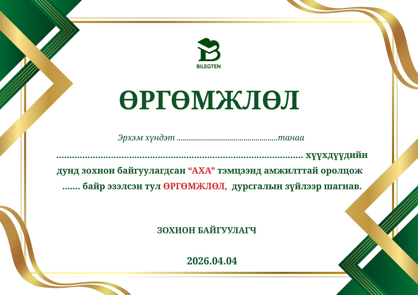 Нэр, огноо, текстийг өөрөө өөрчилж болно.